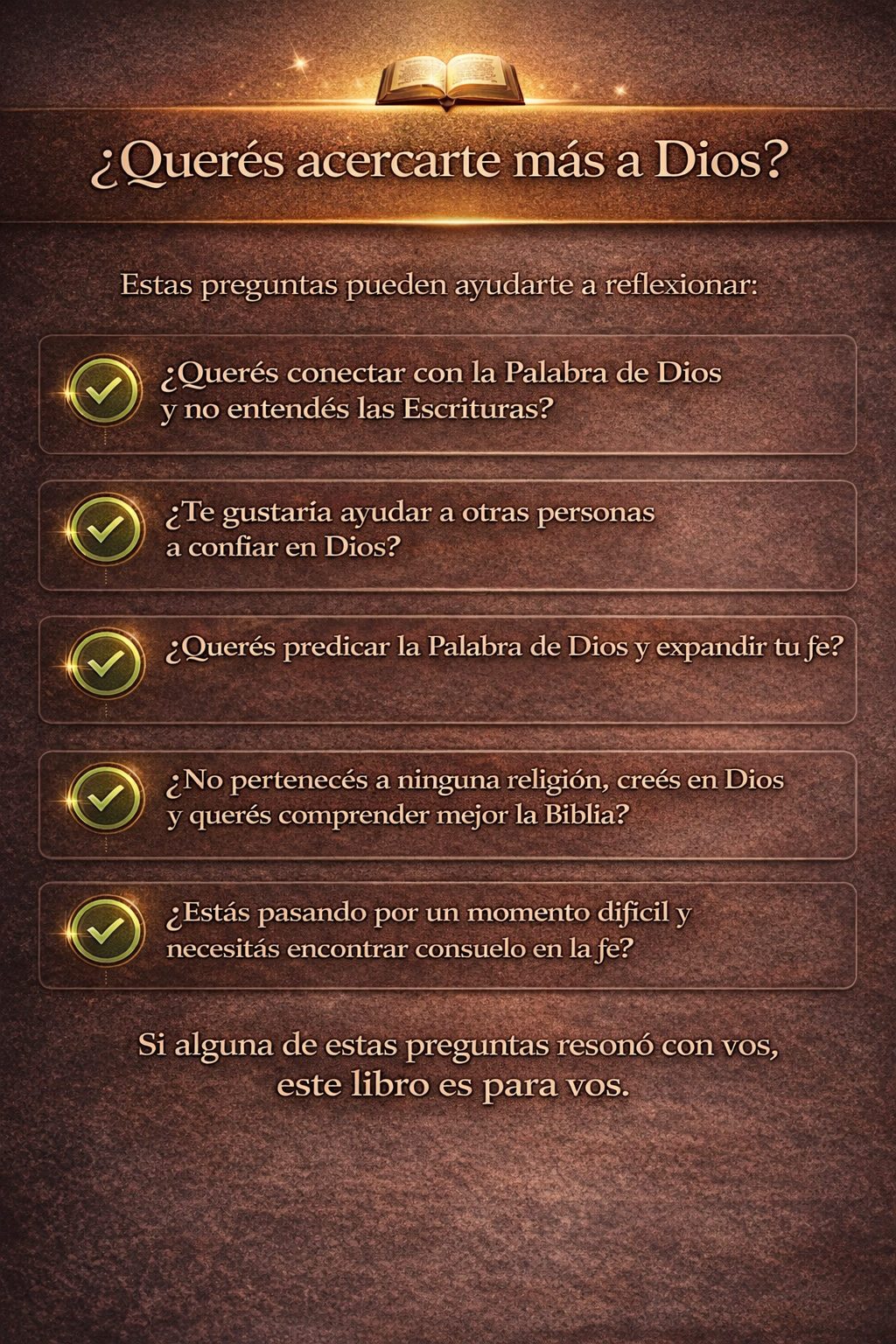 No necesitás ser religioso ni tener conocimientos previos. El libro está pensado para cualquier persona que cree en Dios —o lo está buscando— y desea comprender la Biblia de forma clara, cercana y humana, sin tecnicismos ni lenguaje distante.